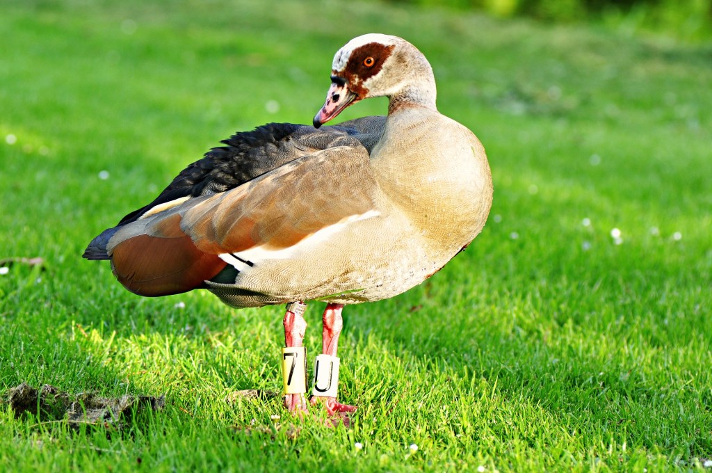 Während ich so verdrießlich in meinem Schaukelstuhl hocke und nicht friedlich, sondern trotzig vor und zurück schaukle, höre ich plötzlich ein lautes schnatterndes Tröten. Vorsichtig schaue ich über meine Knie hinweg in den Garten. Nichts hat sich verändert, er liegt noch genauso unwirtlich da wie vor hin. Doch da höre ich es wieder. Diesmal lauter. Es klingt aufgeregt und fast fordernd. Und mit einem Mal entdecke ich eine bunte Gans die im Sturzflug auf meinen Garten zielt. Kurz vor meinem Steingarten stoppt sie, rudert mit den Flügeln zurück und streckt die Füße vor bis diese den von mir gestern so mühsam geschrubbten Stein berühren. Nun steht sie da, oben auf der Spitze meines Steingartens und schaut sich um. Fast schon suchend wirkt sie. Ich richte mich auf. Dabei erzeugt der hölzerne alte Schaukelstuhl ein knarzendes Geräusch. Die Nilgans springt kurz hoch und dreht sich dann zu mir um. Neugierig legt sie den Kopf schief und schaut mich an. Dann lässt sie wieder ihr forderndes schnatterndes Tröten erklingen.