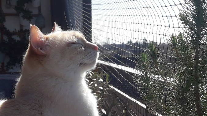 Lächelnd reckt sie ihre Nase in die Sonne, die Katze.