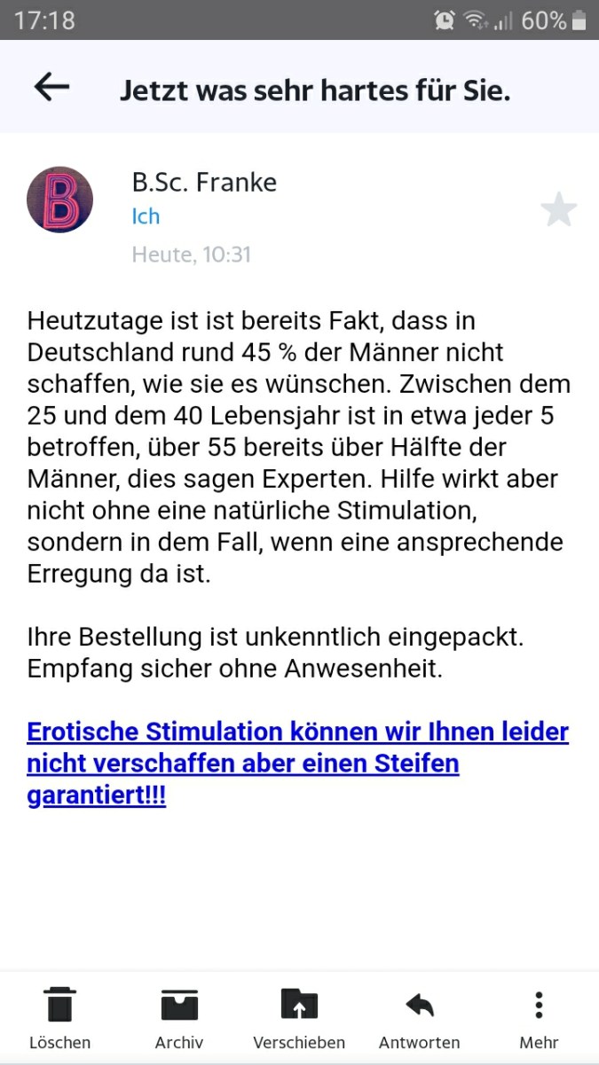Der Absender, ein gewisser Franke, machte mich sehr neugierig. Offensichtlich wollte er mir etwas schenken. Also öffnete ich und las, was er für mich hat. Die Mail war kurz. Alles knapp auf den Punkt gebracht ohne großen Smalltalk. In der heutigen Zeit braucht man auch keine Anrede, wer hat schon Zeit für sowas. Im ersten Absatz machte Franke mich daher ohne Umschweife auf mein Problem aufmerksam. Er war dabei jedoch so einfühlsam und teilte mir mit, dass ich nicht allein damit bin. Sorgen brauchte ich mich wohl auch nicht um das Problem, denn der liebe Franke hatte sich bereits um eine Lösung gekümmert. Klasse! Soviel Nächstenliebe hätte ich nicht mal in Corona Zeiten erwartet.
